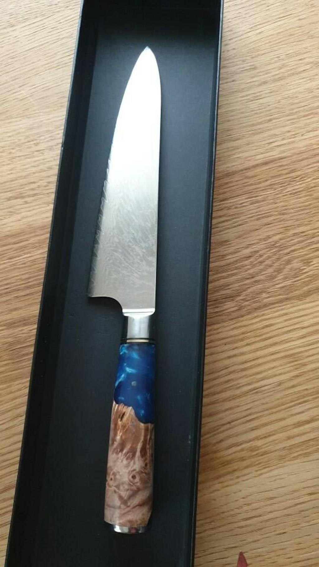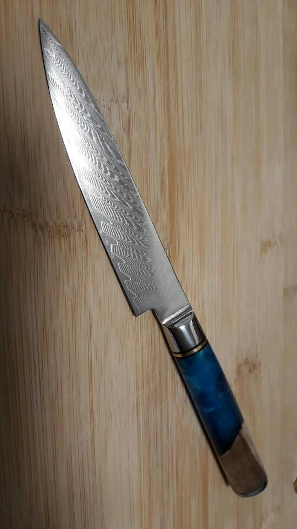 You'll love the stylish blue resin-wood handle. It further adds to the bold visual appeal of the knife. The blue resin gets chemically stabilized, reinforcing the wood, so it's far less likely to warp or crack.